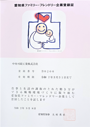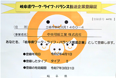岐阜県では、仕事と家庭の両立支援に取り組む企業・団体を「岐阜県ワーク・ライフ・バランス推進企業」として認定する制度があります。この度、岐阜久尻工場は認定企業として登録されました。